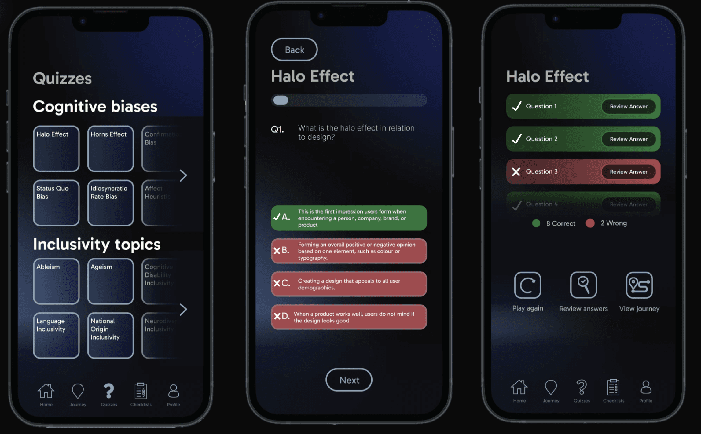 The quizzes aim to improve designers instinct with designs, and the checklists aim to improve how they go about inclusivity within their design process.